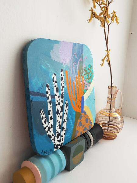 A continuation of the Coral Study collection released in April 2020 these pieces explore deeper colour palettes, neutral tones and oddly shaped bases, painted on a selection of raw timber and curved edged plywood.
