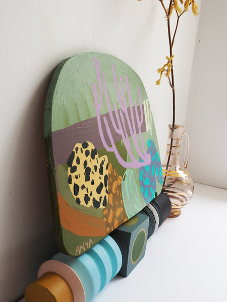 A continuation of the Coral Study collection released in April 2020 these pieces explore deeper colour palettes, neutral tones and oddly shaped bases, painted on a selection of raw timber and curved edged plywood.