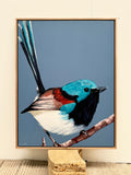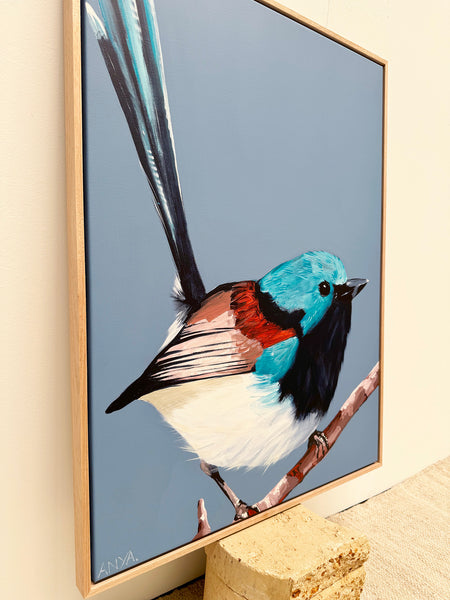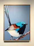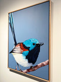 Stretched and framed in low profile oak floating frame